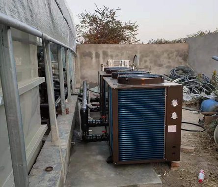 選用公司YJR-D-5HP空氣源熱泵機組1臺(養殖專用熱泵),每單臺YJR-D-5HP的空氣源熱泵機組的輸入功率4.5KW,額定制熱量20KW;