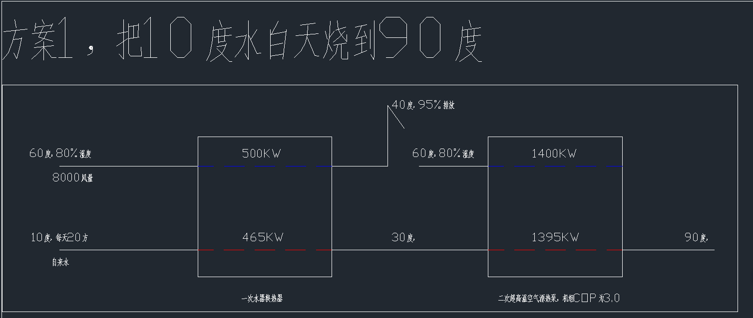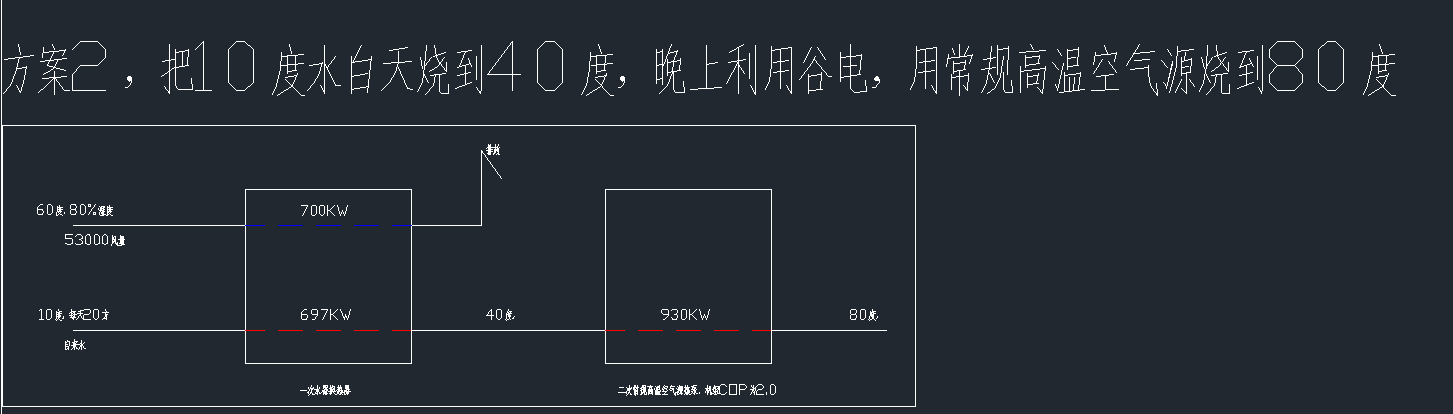 說明:冷水初始溫度按照10度來算,白天通過生產(chǎn)上面廢氣熱量把10度熱水加熱到40度,晚上利用谷電,用常規(guī)高溫空氣能燒到80度。