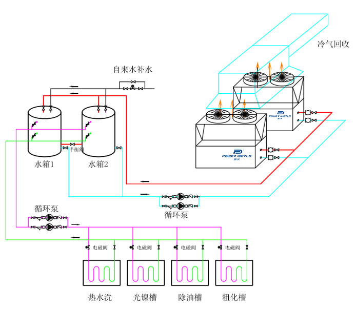 通過熱泵主機加熱儲熱水箱的熱水,再由熱水通過槽內放置的蛇形鈦管加熱槽液,由溫度控制器控制水管電磁閥的開關來控制溫度,有換熱溫差,可集中供熱。適用于手動線、連續鍍線等槽液較小,電鍍加熱節能槽較多的電鍍廠。