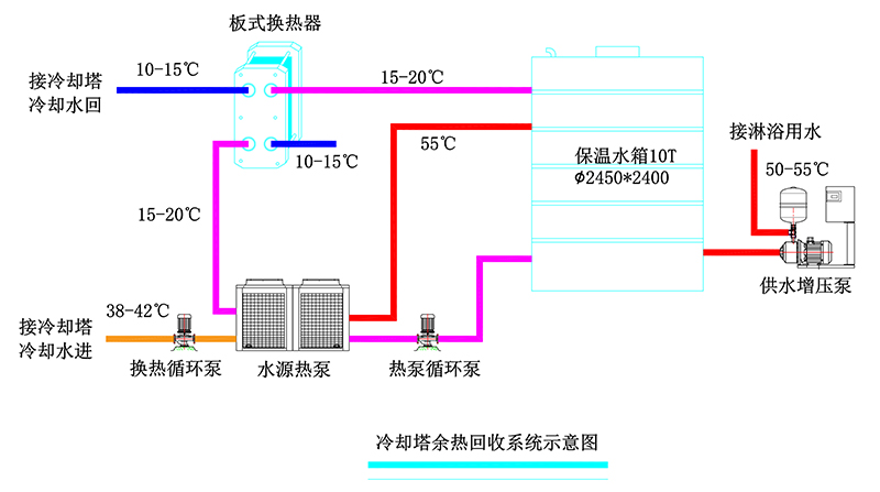 工業冷卻塔在實際生產中,余熱沒有回收,利用水源熱泵進行部分余熱回收,滿足熱水需求的同時,還能降低冷卻塔的運行時間,達到雙贏的節能效果。