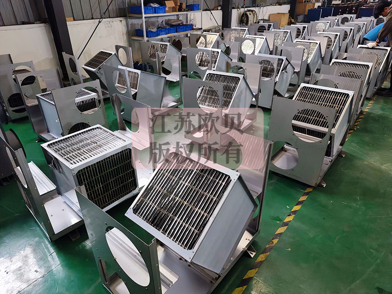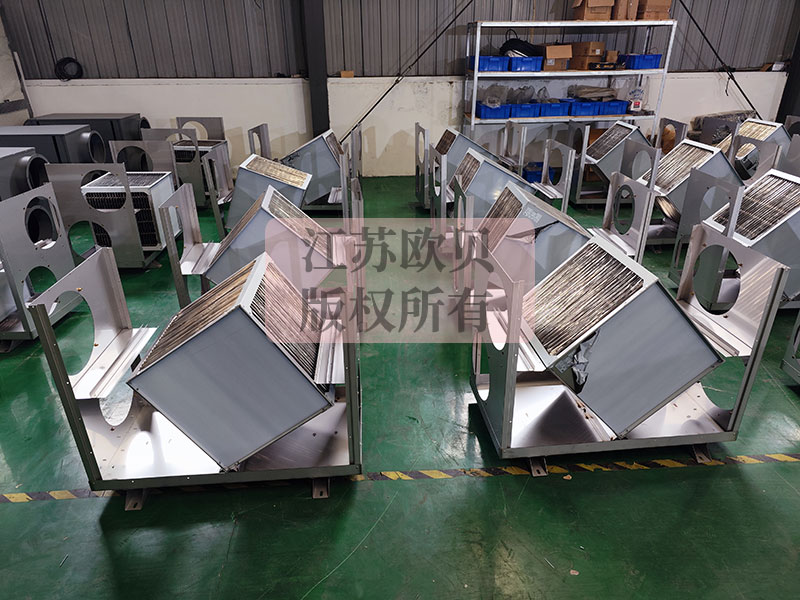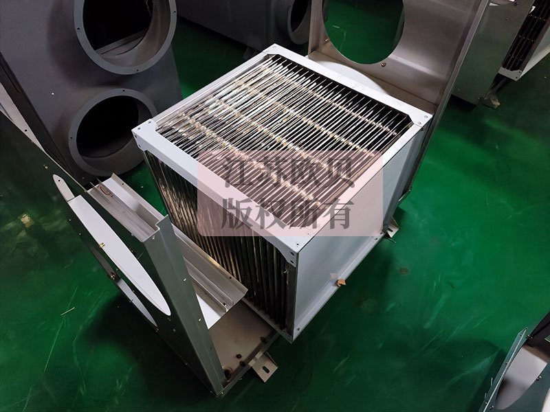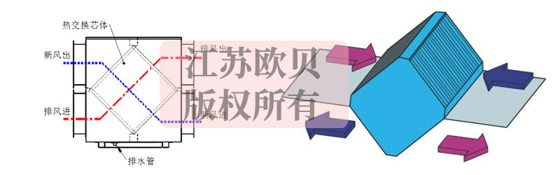 在能量回收排濕器內置有空氣-空氣熱交換芯片,烘房內排出的高溫高濕空氣(排風)先經過熱交換芯后再排掉, 環境新風先經過熱交換芯再送入烘房,這兩股空氣在能量回收排濕器內進行熱量交換 ,由于兩股空氣完全隔離,排出的濕氣不會混入新風中 ,新風吸收排風的熱量后溫度會大幅上升而含濕量不會變化,排風在與新風進行熱量交換后產生大量冷凝水,溫度也會下降,隨后排出到室外環境中。由于新風經熱交換后溫度會顯著升高,可大幅減少將新風加熱到烘房所需溫度的能耗。