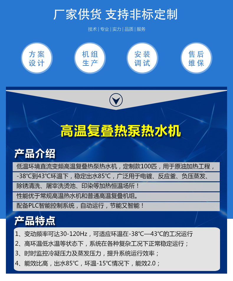 低溫環(huán)境直流變頻高溫復疊熱泵熱水機,定制款100匹,用于原油加熱工程,-38℃到43℃環(huán)溫下,穩(wěn)定出水85℃,廣泛用于電鍍、反應釜、負壓蒸發(fā)、除銹清洗、屠宰洗燙池、印染等加熱/恒溫場所!咨詢:13701597080