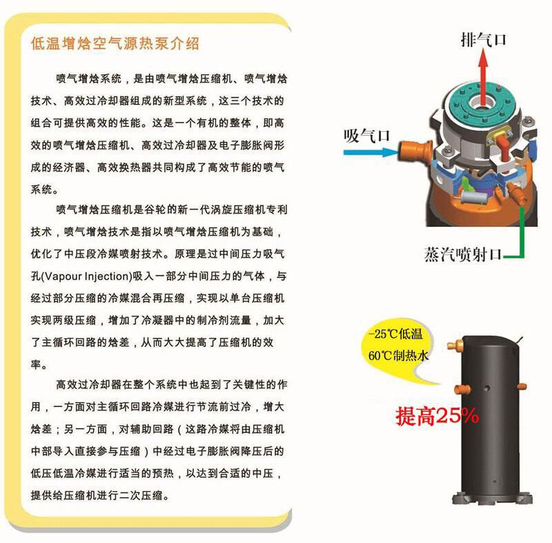 | 噴氣增焓低溫型熱泵機組采用的是噴氣增焓技術,是江蘇歐貝熱能工程技術研究開發中心的重點技術研發成果,該產品在低溫環境中比普通機組能效比高,環境溫度-25度時能效比可達到2.0,是北方寒冷地區的理想設備。 *低溫空氣源熱水機組是以空氣為換熱介質,產生熱水。